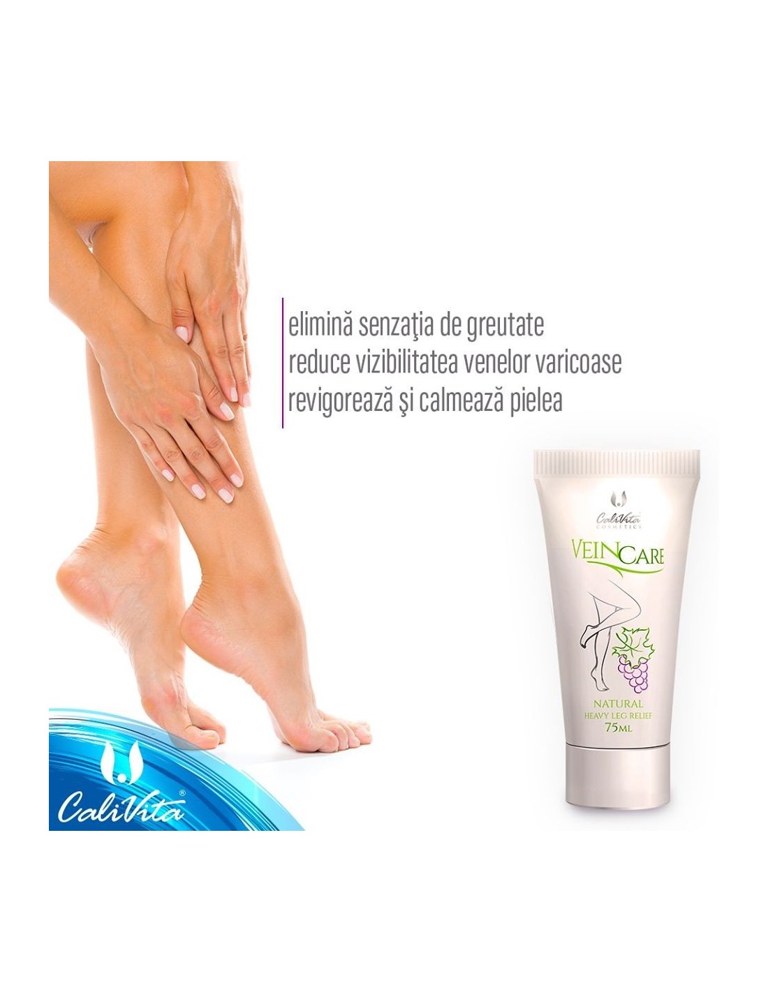 Produsul Vein Care fabricat de CaliVita este o crema conceputa in special pentru problemele de la nivelul venelor, componentele sale principale fiind extractul de frunze de struguri rosii si tamaie indiana(Boswellia serrata) si extractul din planta Siegesbeckia care ajuta la mentinerea sanatatii vaselor capilare.
